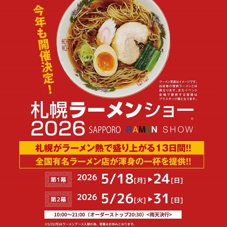 札幌ラーメンショー2026は、5月に札幌大通公園西8丁目で開催されるラーメンイベントです。全国各地の有名ラーメン店が集結し、第1幕・第2幕の会期でラーメンを提供します。